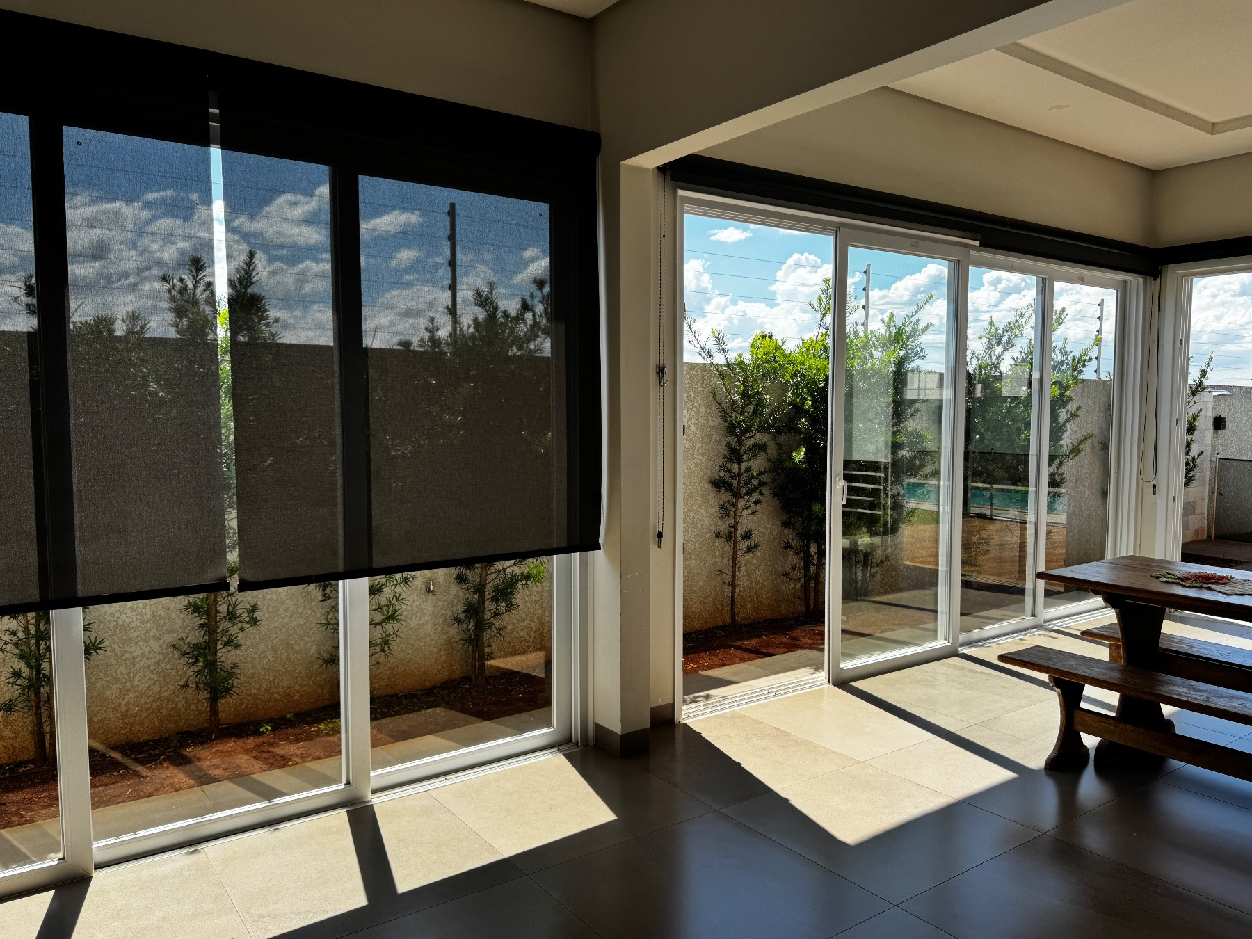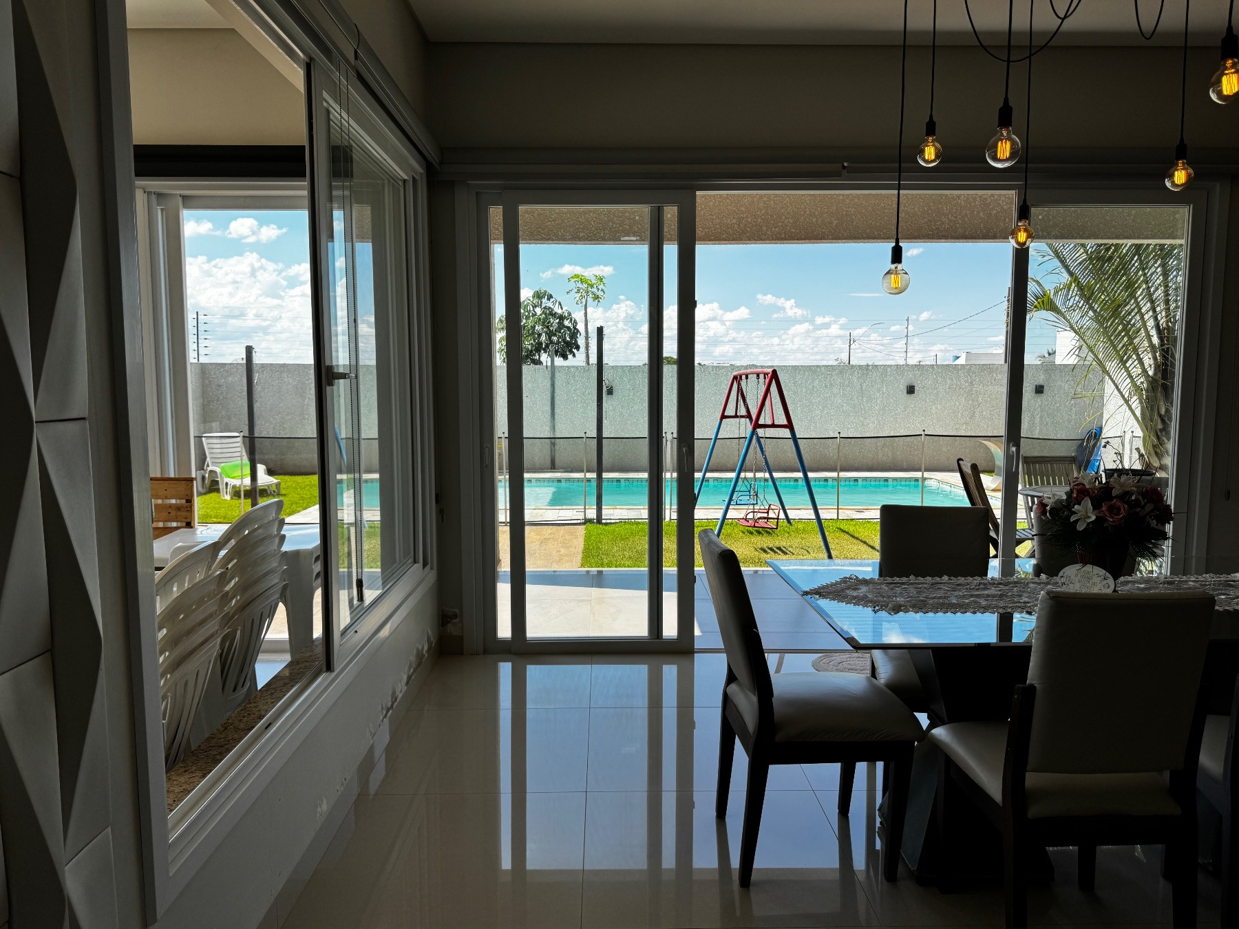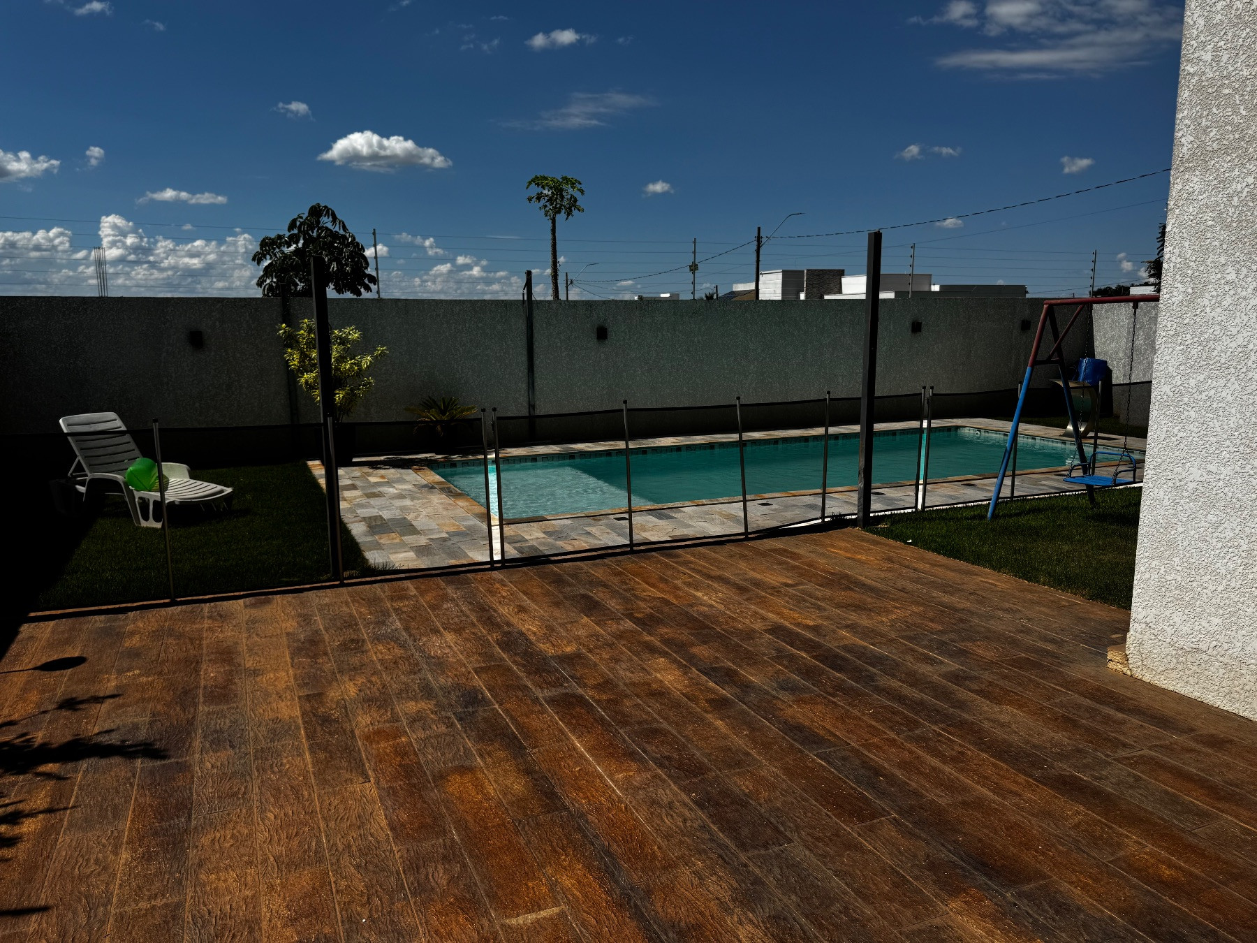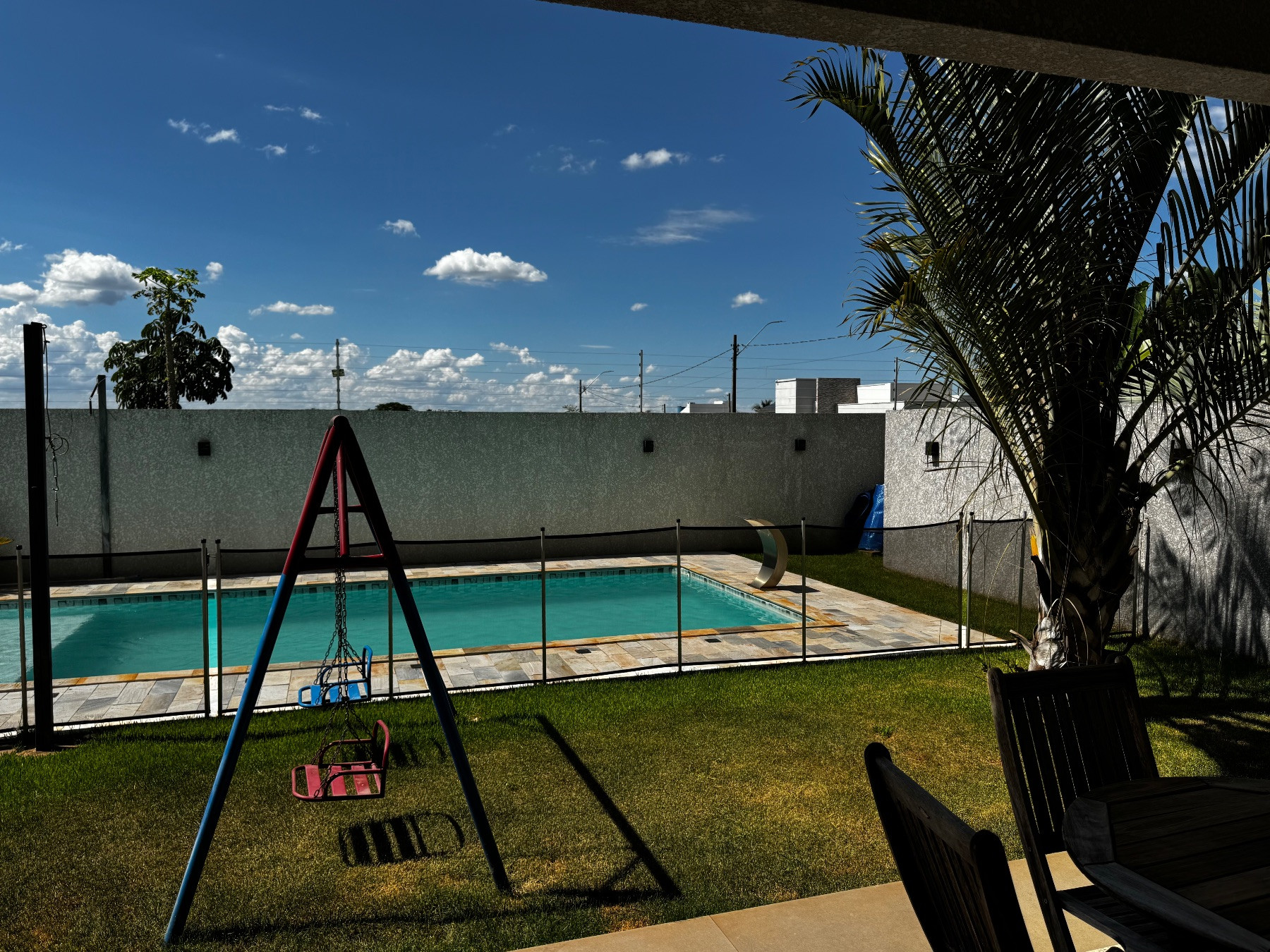 A piscina integrada ao amplo quintal cria um verdadeiro espaço de lazer privativo, perfeito para relaxar e aproveitar os dias de sol com conforto e privacidade.